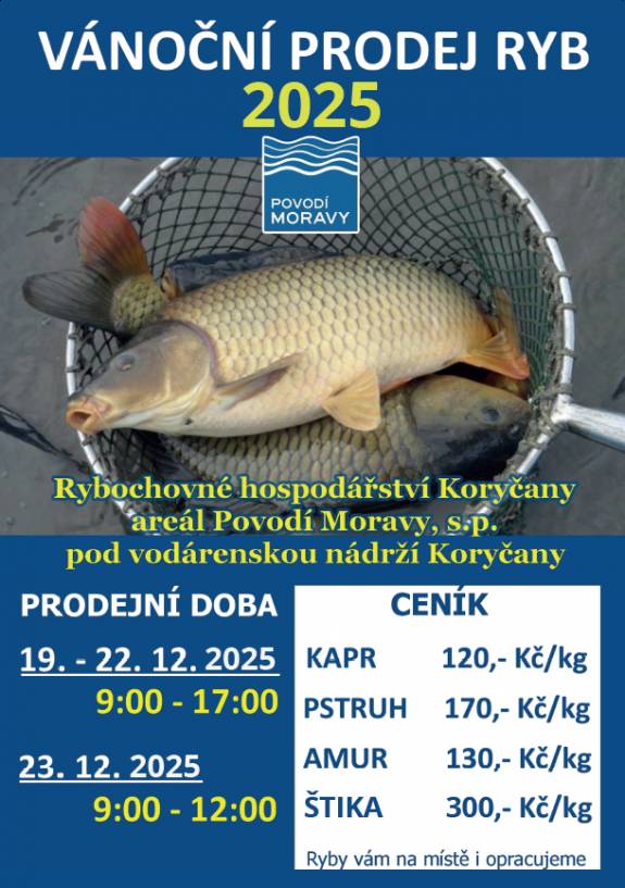 Kapr, pstruh, amur a štika – všechny tyto druhy ryb Vám nabízíme k prodeji v našem rybochovném zařízení v Koryčanech. Vánoční prodej začne v pátek 19. prosince a potrvá až do úterý před Štědrým dnem.