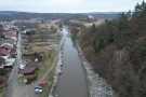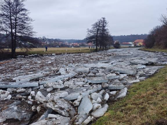 Obr.: Nahromaděné ledové kry v Oslavě způsobily vzdutí vody (7. února 2026)