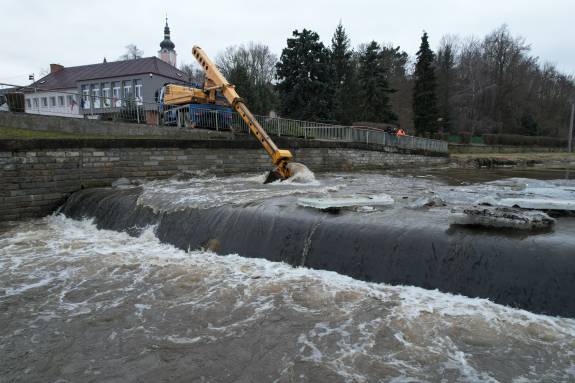 Obr. Technika Povodí Moravy rozbíjí ledovou celinu nad pevným stupněm v Oslavanech, aby uvolnila koryto (7. února 2026)