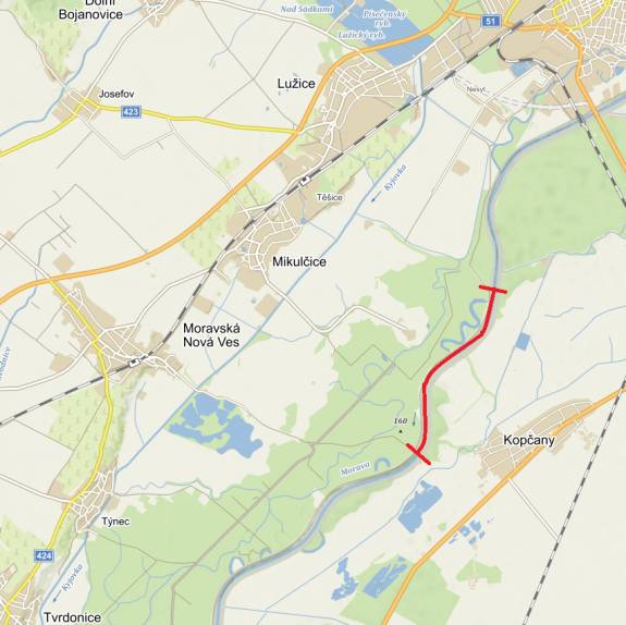 řkm 98,800 po hájenku v Moravské Nové Vsi řkm 93,450.